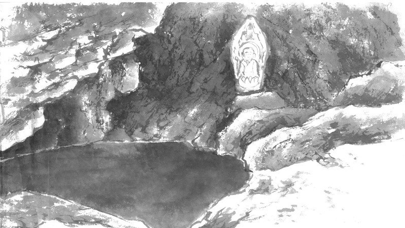 お坊さんは、その香りをたよりに藤蔓でからめた丸太橋を渡り、山の中腹まで来ると、急に、辺りが明るくなりました。大きな屏風の様な岩が二面立ちはだかっております。岩の下の方を見ると、湯煙が立ちこめ、岩が黄ばんでいます。