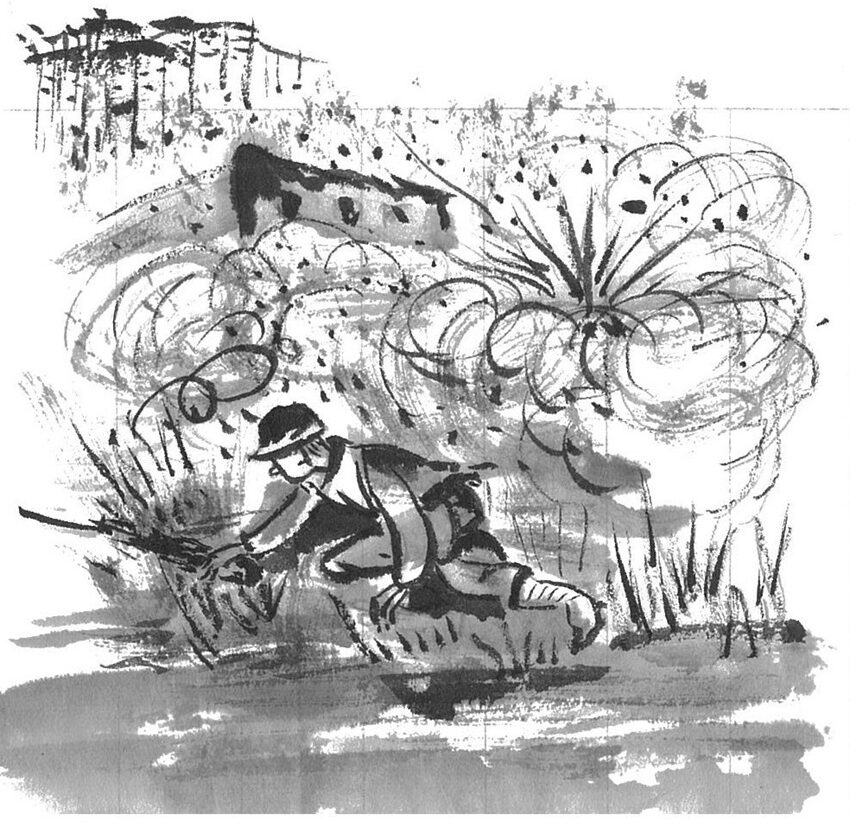 木の生い茂る遮蔽物(外から見えないように遮りかくす物)に隠れていた。なおも攻撃は止まない。まさに一瞬の出来事だった。
