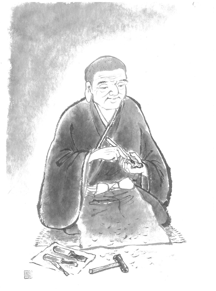 お坊さまはそばに積んであったたき木から一本をぬきとると何やら刻みはじめました。